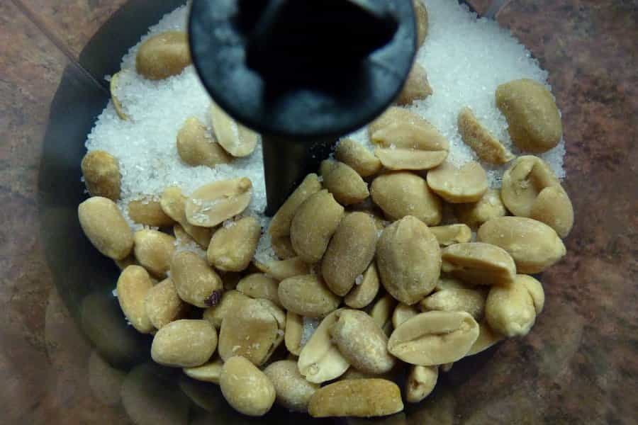 En un procesador de alimentos pon el maní y el azúcar. Muele hasta lograr pequeños trozos que forman una pasta.