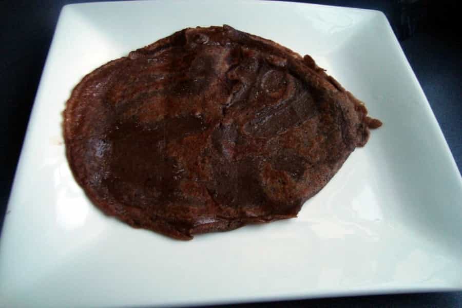Pincelar un sartén con margarina derretida o con unas gotas de aceite, calentar a fuego medio, cuando el sartén este caliente, verter una porción de batido, mover para distribuir por todo el sartén. Cocinar por 2 minutos, darlo vuelta y cocinar por 30 segundos. Traspasar el panqueque de chocolate a un plato, repetir la operación hasta terminar con todo el batido.
