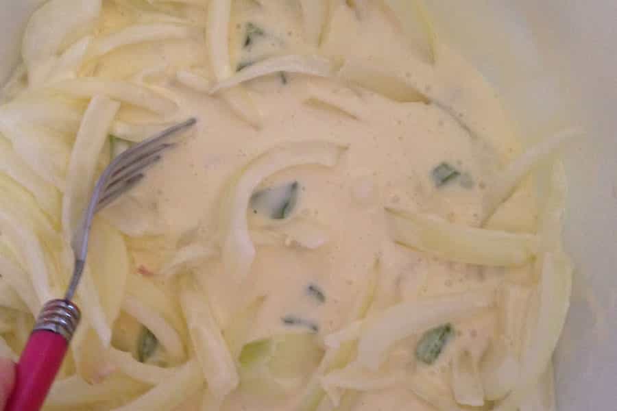Bates el huevo y agregar la crema, la cebolla cortada en pluma y el pimentón cortado en cuadros. La sal y la pimienta la agregas a tu gusto.