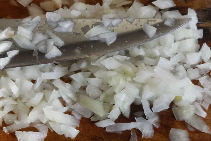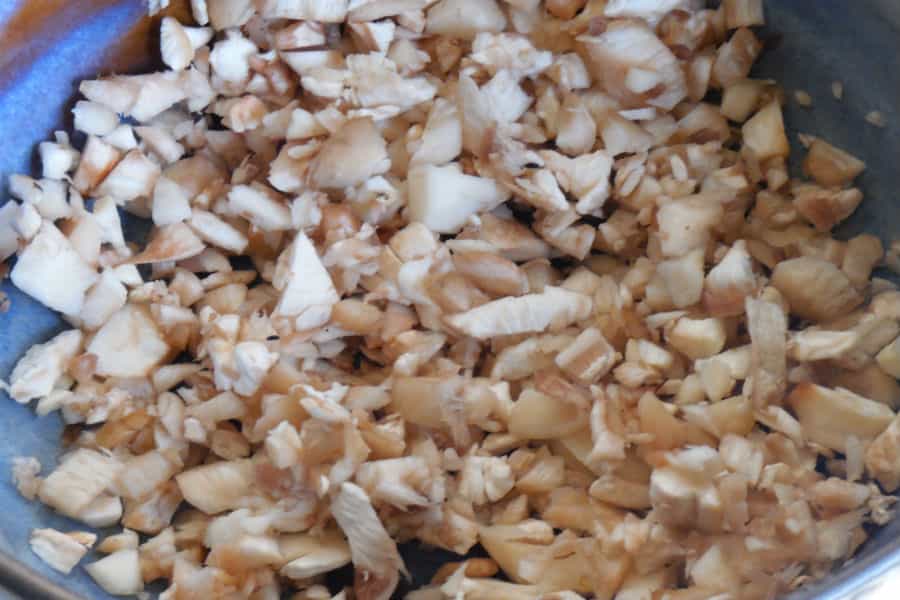 y los picamos en cuadritos, al igual que el Ciboullete. Reserva un poco de este para decorar después.