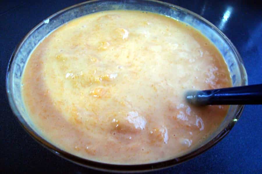 En un pocillo mezclar leche condensada, pulpa de mango y las yemas, revolver suavemente hasta formar una crema. Refrigerar por 1 hora.