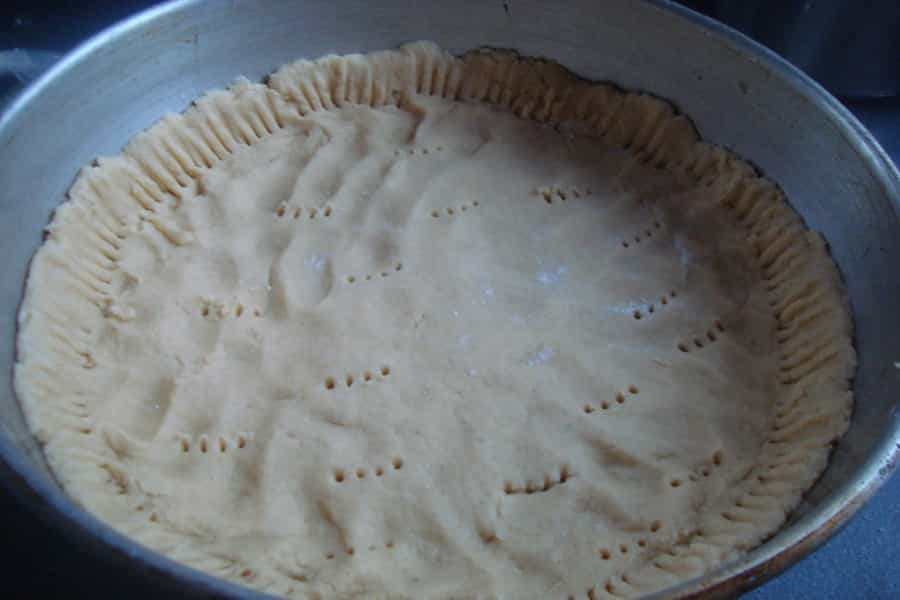Refrigerar la masa por 30 minutos. Transcurrido el tiempo de refrigeración,espolvorear una mesa con harina y estirar la masa. Disponer la masa sobre un molde enmantequillado, formando los bordes.