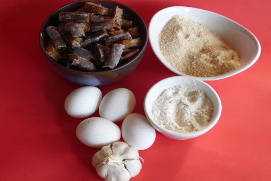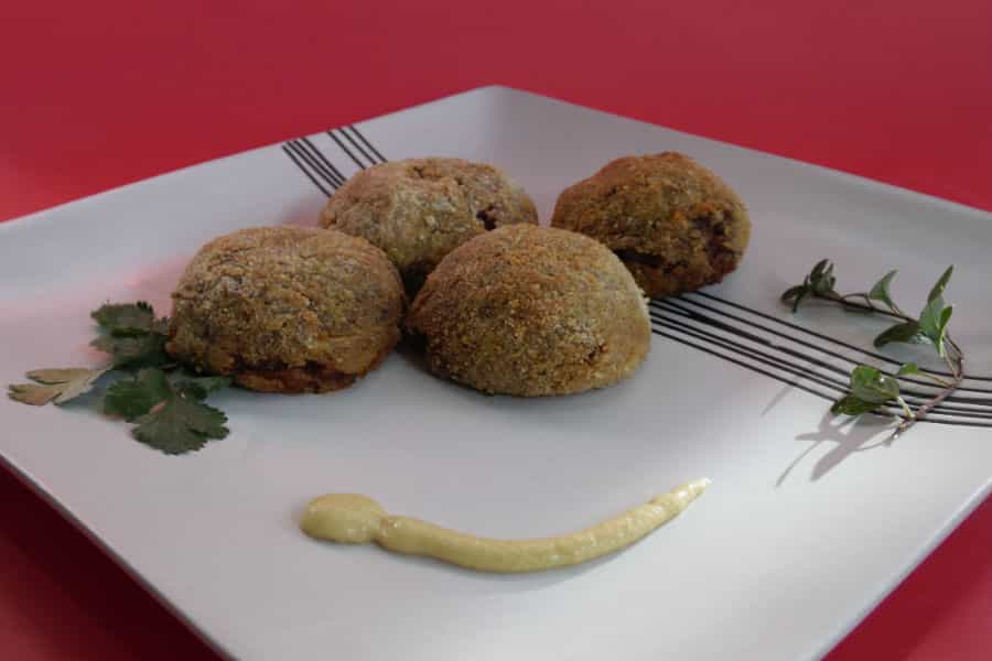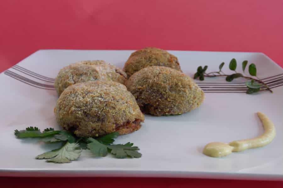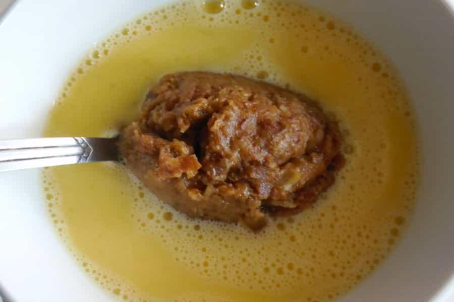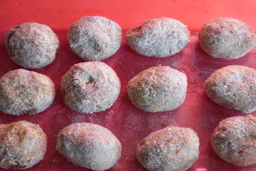 Luego con la ayuda de una cuchara formamos pequeñas bolitas, las cuales sumergimos en los huevos batidos.