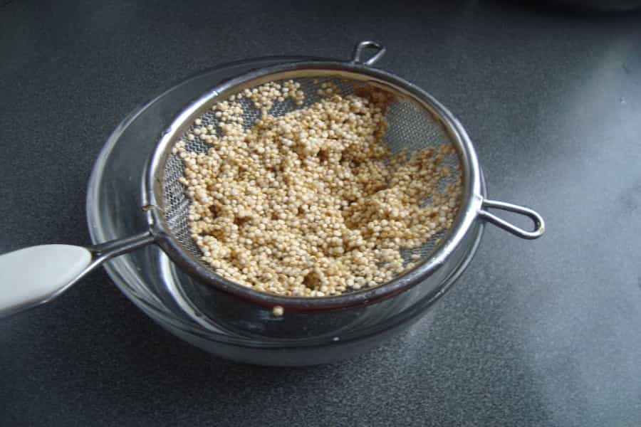 Colocar la quínoa en un colador y lavarla durante 2 minutos bajo la llave del agua fría, revolver con la mano. Escurrir y reservar.