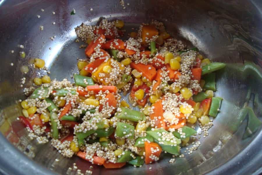 En una olla con 1 cucharadas de aceite de oliva caliente sofreír por 2 minutos el ajo picado, cebollín y pimentón picado en cubos pequeños, incorporar las verduras lavadas y picadas y la quínoa reservada, sazonar a gusto.