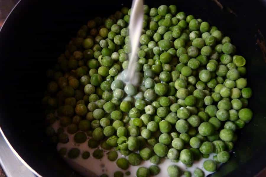 En un sartén sofríe los ajos enteros y pelados usando el aceite de maravilla, hasta que queden dorados. Agrega las arvejas, la leche, el aciete de oliva y el resto de los aliños y deja cocer por unos 8 minutos.