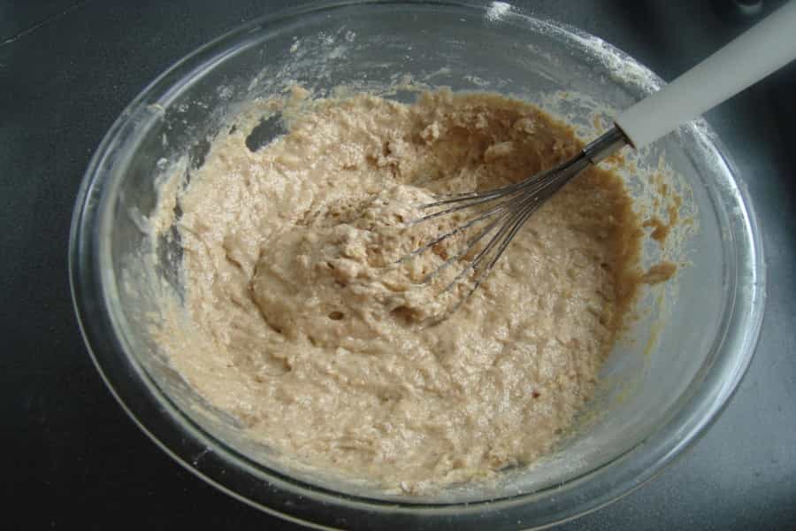 En un recipiente mezclar aceite y azúcar. Añadir poco a poco los ingredientes secos y el agua tibia, revolver suavemente hasta integrar bien.