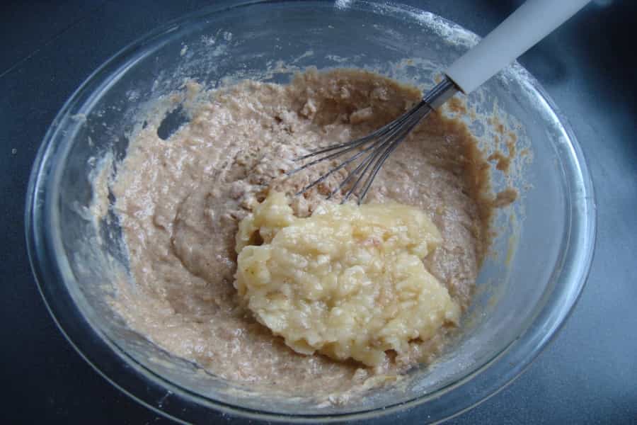 En un pocillo moler los plátanos maduros. Incorporar los plátanos molidos a la preparación, revolver suavemente hasta integrar bien.