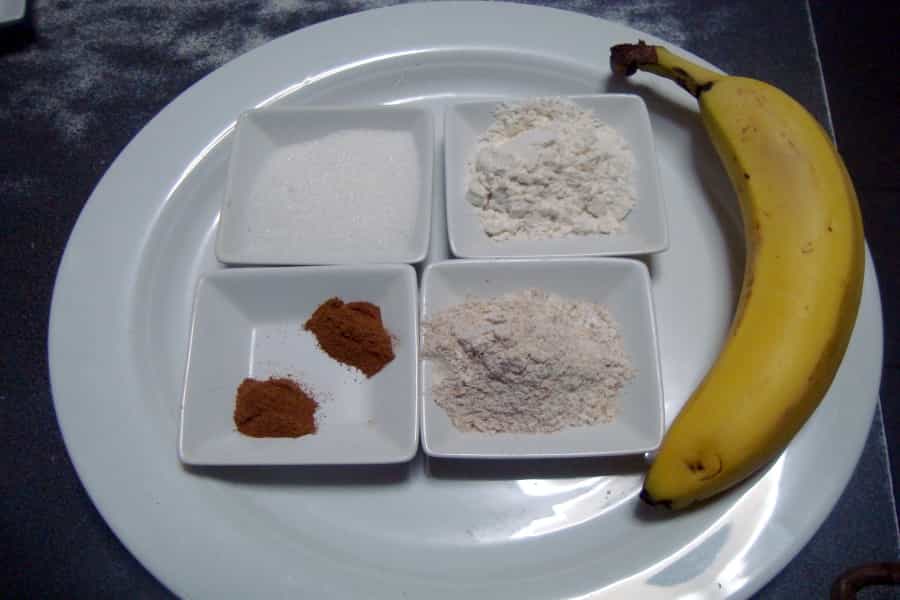 En un recipiente mezclar los ingredientes secos: harina, harina integral, polvos de hornear, sal, canela en polvo, nuez moscada. Reservar.