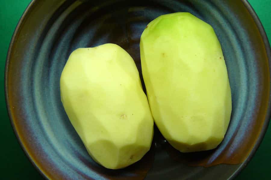 Pelo las papas, rallo una y la otra la corto en trozos pequeños y la reservo.