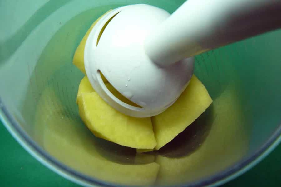 Coloco las papas en trozos en el bol y proceso con minipimer hasta que estén líquidas, puedo agregar un poco de agua para ayudar a este proceso.