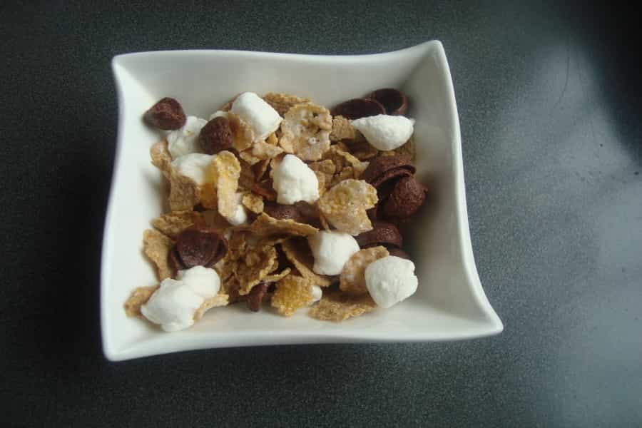 En un recipiente mezclar los cereales, los marshmallows, añadir miel o yogurt.