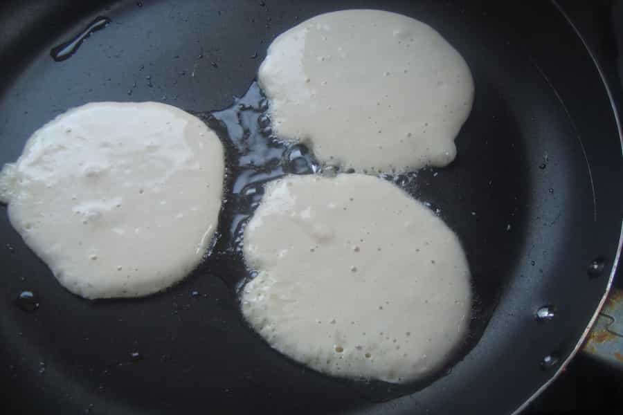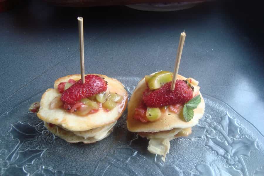 Cocina hasta que los bordes estén levemente dorados, dar vuelta y cocinar por el otro lado. Retirar del sartén y colocarlos en un plato, tapar con un paño limpio. En un pocillo mezclar 1 taza de frutas frescas picadas con 2 cucharadas de miel. Rellenar los hotcakes con la fruta con miel, puedes preparar de a uno o formar una torre.