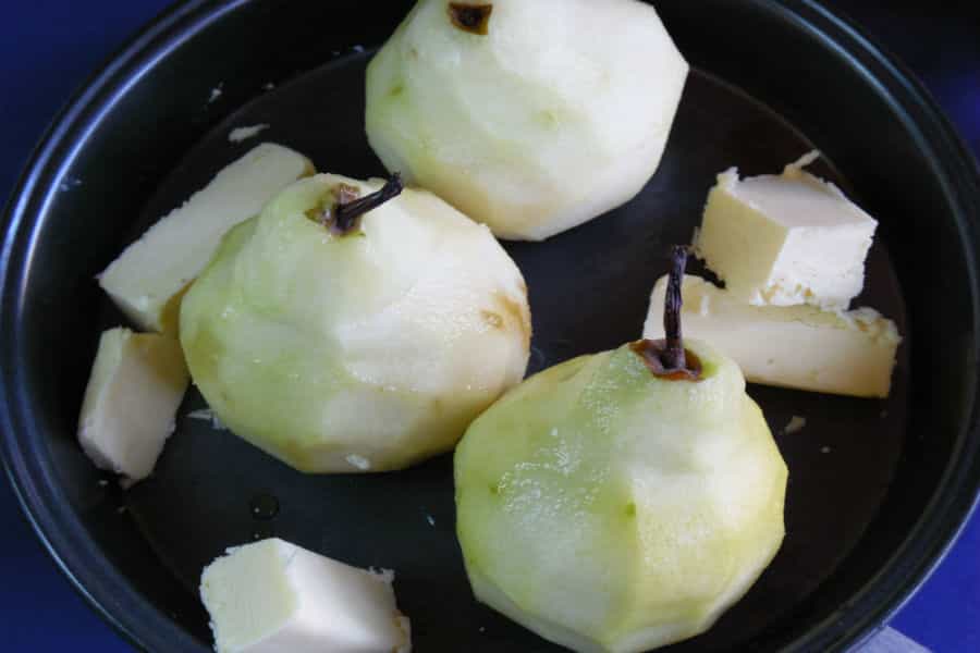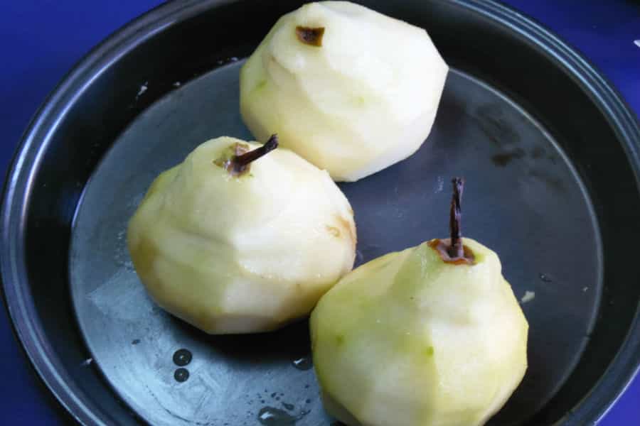 Lava y pelas las peras. Déjales el tallo, porque le da un toque más rústico. Luego en mantequilla un molde y coloca las peras.