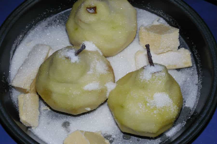 Mete al horno durante 15 minutos a fuego medio. Cuando las peras estén durante 7 minutos en el horno sácalas y báñalas con el caramelo que se forma con la mantequilla y el azúcar.