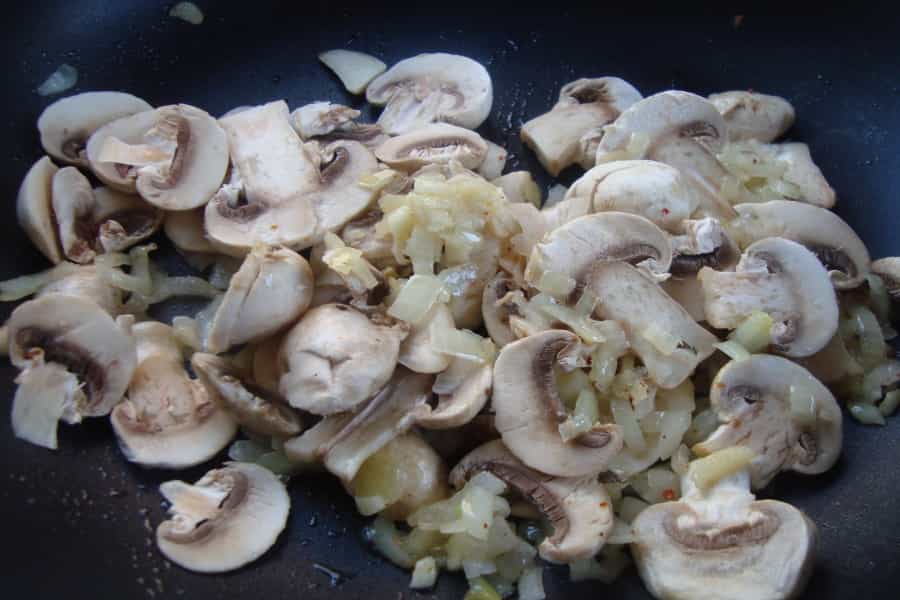 En un sartén con 1 cucharada de aceite caliente, saltear por 2 minutos la cebolla picada en cubos pequeños, agregar el ajo picado y los champiñones cortados en láminas.