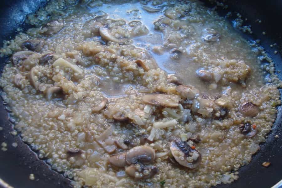 Mezclar y añadir un poco del caldo caliente, revolver. Debes ir añadiendo el caldo en pequeñas cantidades, cuando el risotto se vaya secando, revolver suavemente y seguir cocinando a fuego bajo, destapado (esta operación tarda unos 15 a 20 minutos).