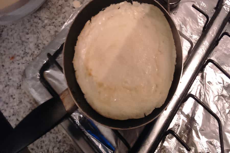 Precalentamos el sartén con aceite y ponemos nuestra mezcla en forma circular, espaciándola con cuidado.