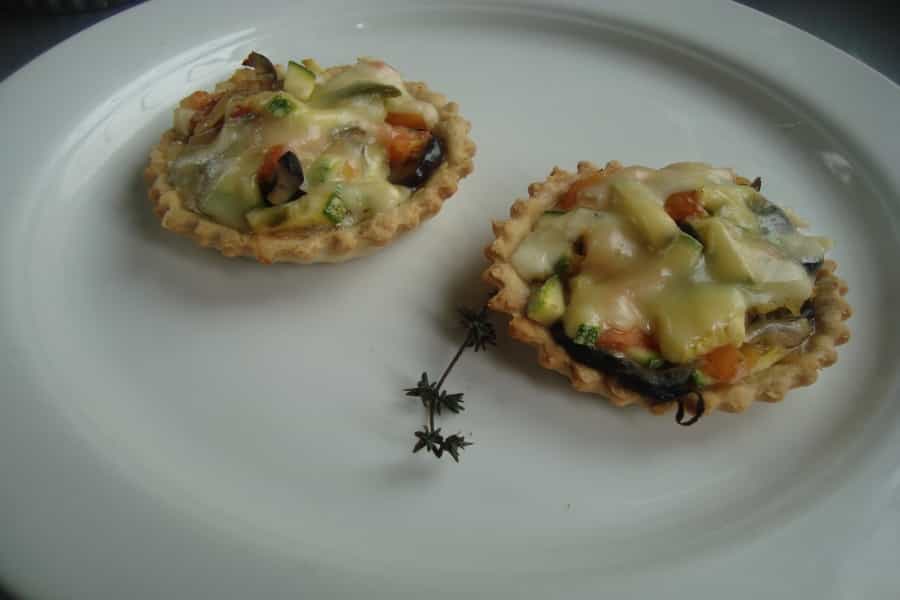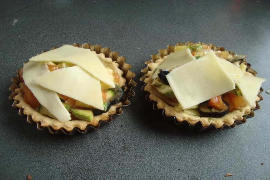Distribuir la mitad del queso sobre la masa pre horneada de la tarta, cubrir con el sofrito mezclado de huevo, terminar distribuyendo el resto del queso. Cocinar la tarta en horno precalentado por 10 a 20 minutos o hasta que el relleno este cuajado. Retirar, puedes servir la tarta mediterránea rustica caliente, tibia o fría.
