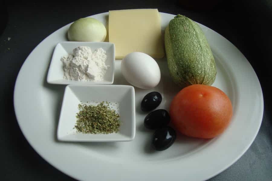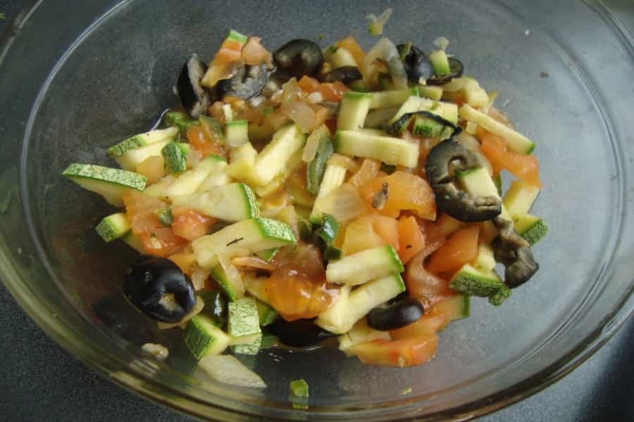 En un sartén con 2 cucharadas de aceite caliente, saltear por 3 minutos cebolla y pimentón cortado en tiras, añadir el zucchini cortado en cubos, los tomates picados, las aceitunas, orégano y tomillo, salpimentar a gusto, cocinar por 10 minutos, apagar y reservar.