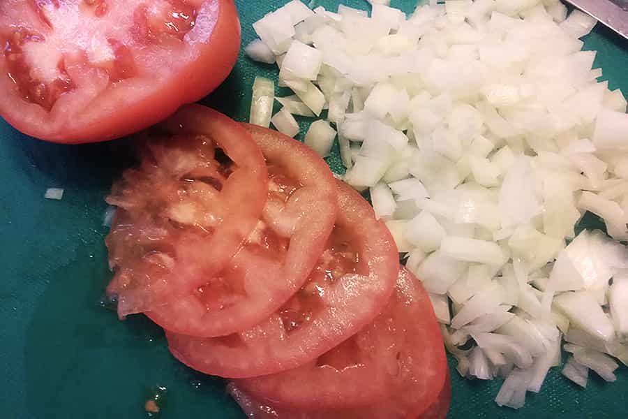 2. Lava el tomate y pela la cebolla. Corta el tomate en rodajas (que reservarás) y pica la cebolla finamente.