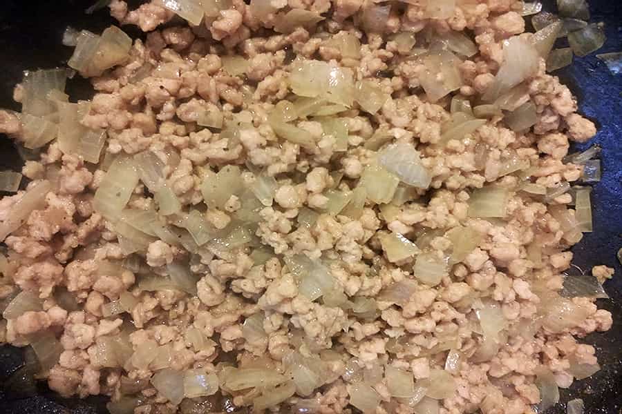 3. Agrega un poco de aceite en un sartén y sofríe la cebolla ligeramente con un poco de sal, hasta que esté transparente. Si la carne de soya está lista, escurre el agua y agrégala al sartén. Añade salsa de soya, pimienta y ajo en polvo. Revuelve unos minutos y deja que los sabores se impregnen.