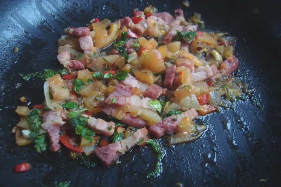 En un sartén con 1 cucharada de aceite caliente, saltear por 2 minutos la cebolla picada en cubos pequeños y el pimentón, incorporar el ajo picado y el tocino cortado, cocinar a fuego bajo por 2 minutos, por ultimo añadir el tomate pelado y picado en cubos, orégano y el perejil, salpimentar a gusto, revolver suavemente y apagar.