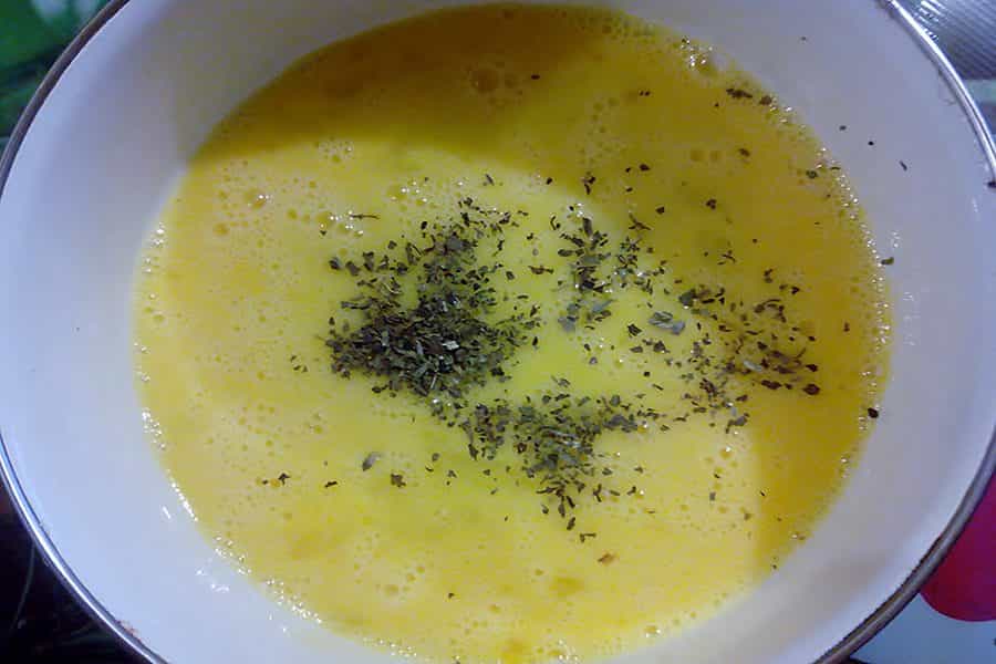 Mientras, en un recipiente batir dos huevos, y ponerles sal y aliños a gusto.