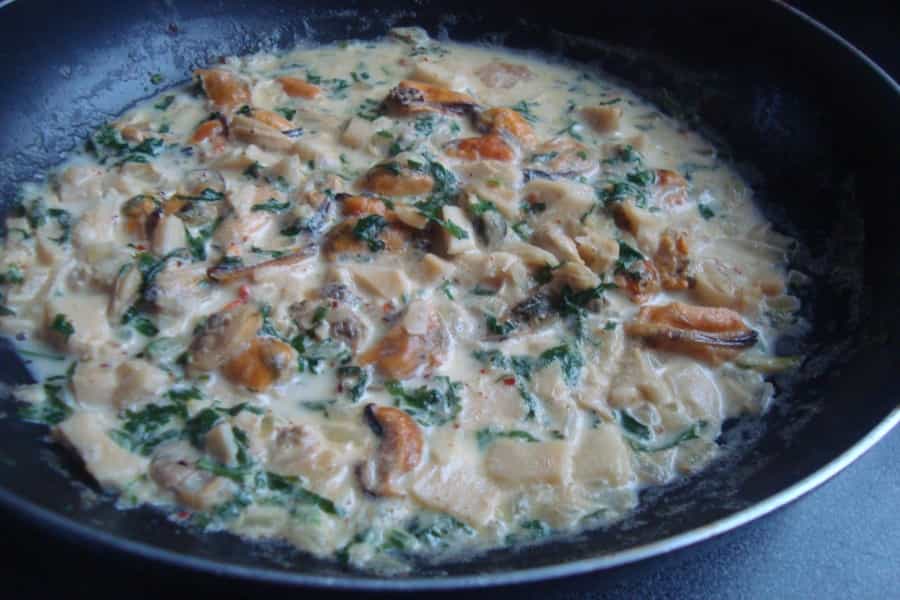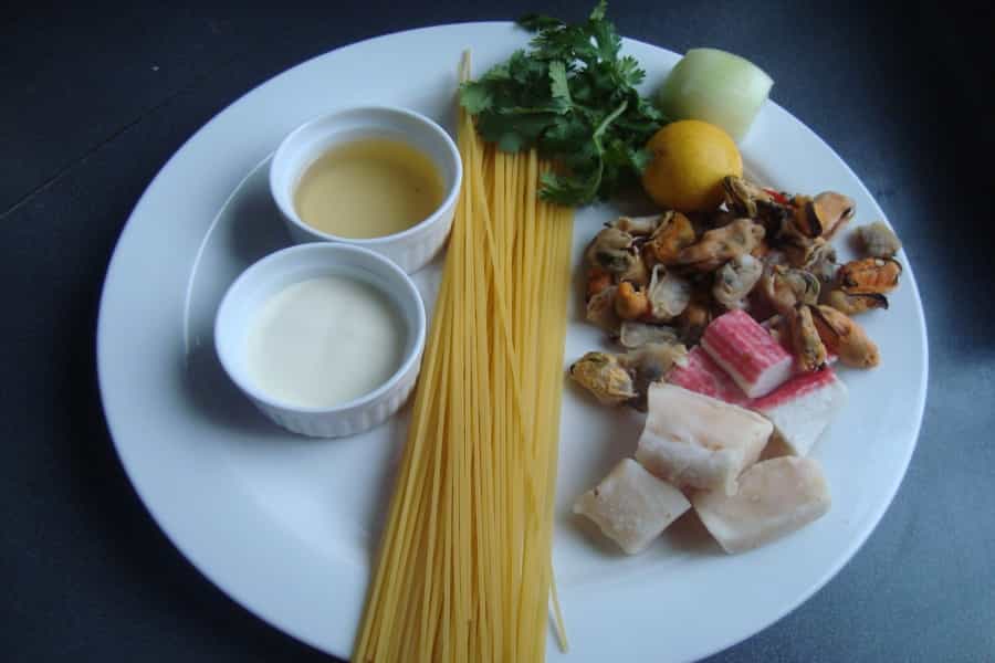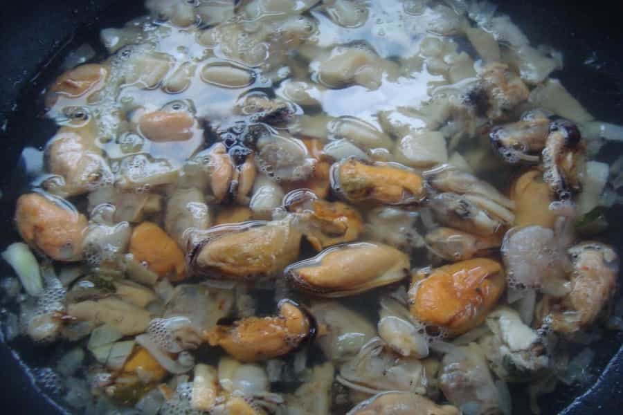 En una olla con 2 cucharadas de mantequilla caliente, saltear la cebolla por 2 minutos, agregar 1 taza de vino blanco y 1 taza de agua, cocinar a fuego medio hasta que hierva. Incorporar los mariscos y el pescado (sin piel y sin espinas) cortado en cubos, seguir cocinando hasta que los mariscos estén blandos.