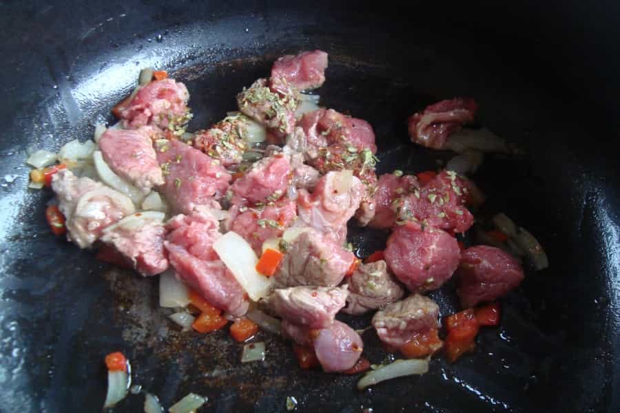 En una olla con dos cucharadas de aceite caliente, saltear por 2 minutos la carne picada en cubos, agregar el ajo cortado finamente, la cebolla picada, sazonar con ají color y orégano.
