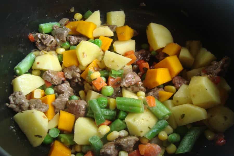 Cocinar por 2 minutos y agrega las papas cortadas en cubos, el zapallo picado y las verduras surtidas, sofreír por 3 minutos para impregnar los sabores.