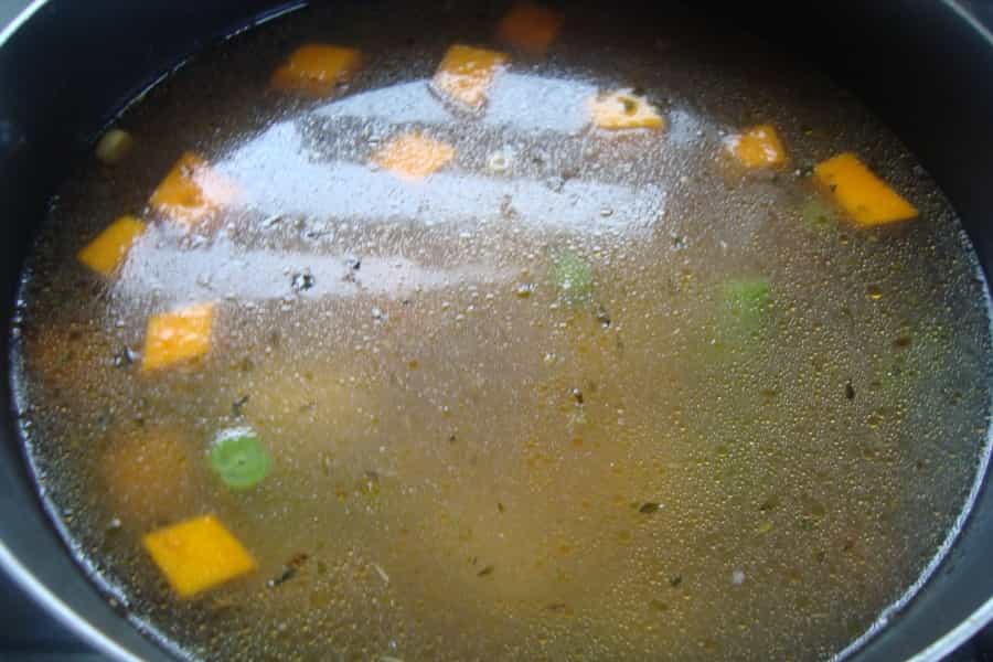 Salpimentar a gusto y verter 1 ½ litro de agua caliente, revolver y cocinar a fuego medio semi tapado por 10 minutos.