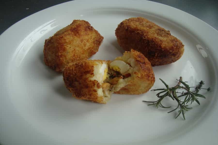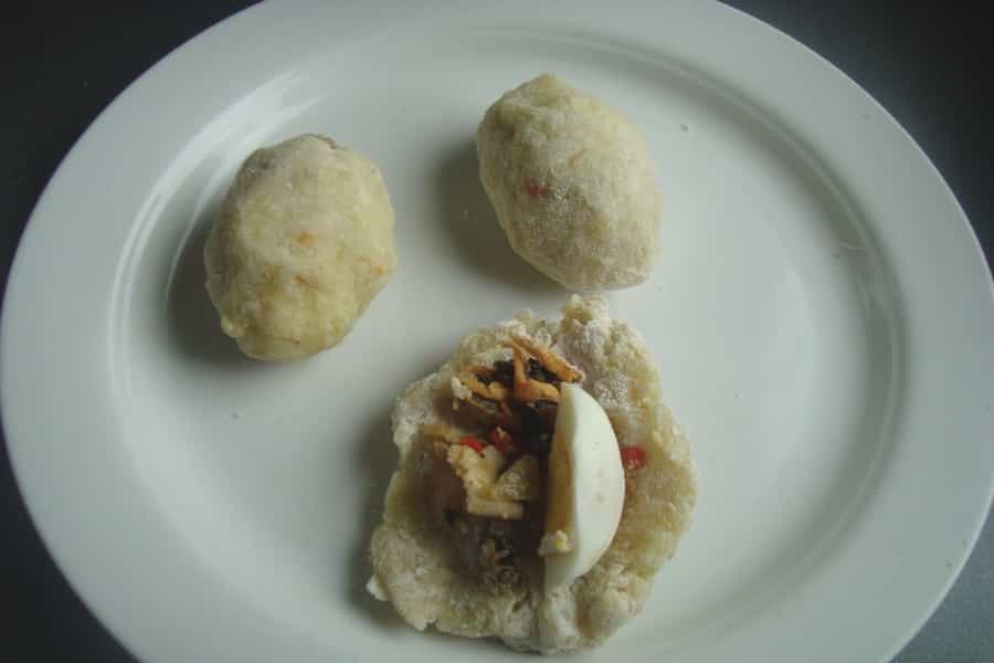 Con las manos limpias y enharinadas tomar una porción de la mezcla de papas, formar una bola y la aplanamos, en el centro colocar dos cucharadas del relleno de mariscos y un trozo de huevo duro, cerrar bien presionando por los bordes. Repetir esta operación hasta terminar con el puré y el relleno de mariscos.