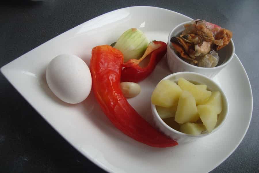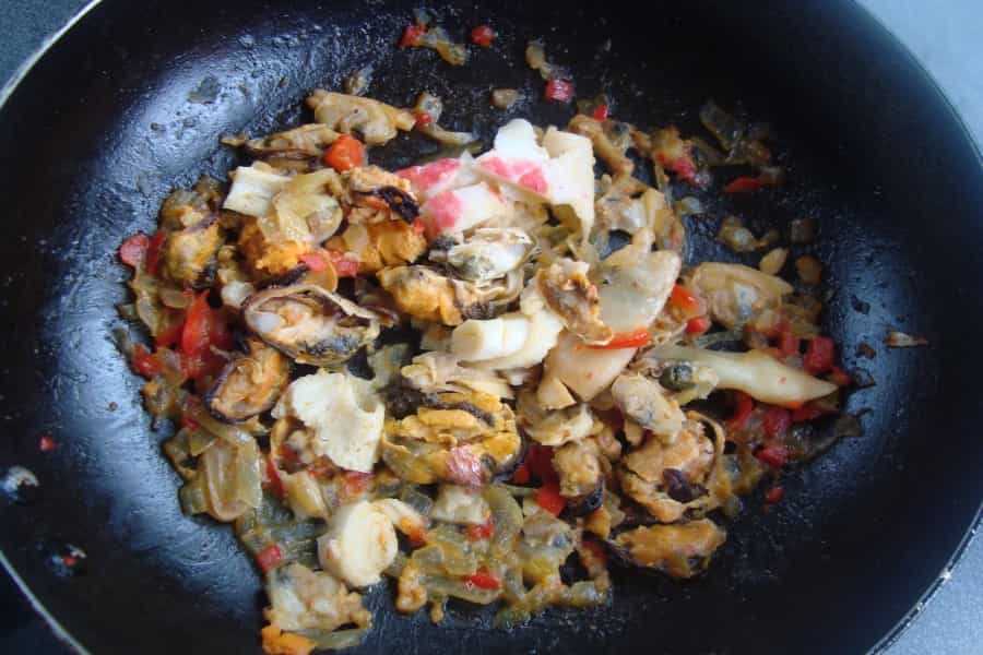 En un sartén con 2 cucharadas de aceite caliente saltear por 2 minutos la cebolla picada en cubos pequeños, añadir pimentón, ajo y ají, revolver y cocinar por 2 minutos. Incorporar los mariscos, sazonar a gusto y seguir la cocción por 5 a 10 minutos o hasta que los mariscos estén cocidos. Dejar enfriar y reservar.