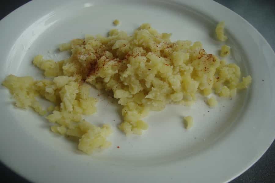 Pelar las papas, cortarlas en cuadrados y cocinarlas a fuego medio en abundante agua con sal, por 15 a 20 minutos o hasta que estén blandas. Escurrir, moler las papas, sazonar con sal y merquén a gusto.