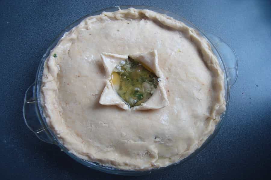 Tapar con el otro círculo de masa. Cerrar los bordes y hacer un orificio al medio de la masa.
