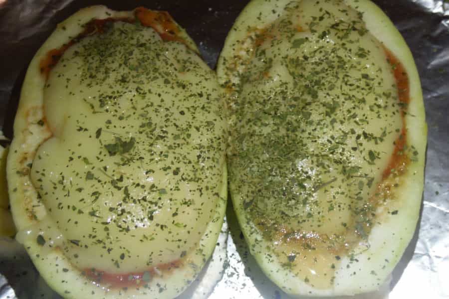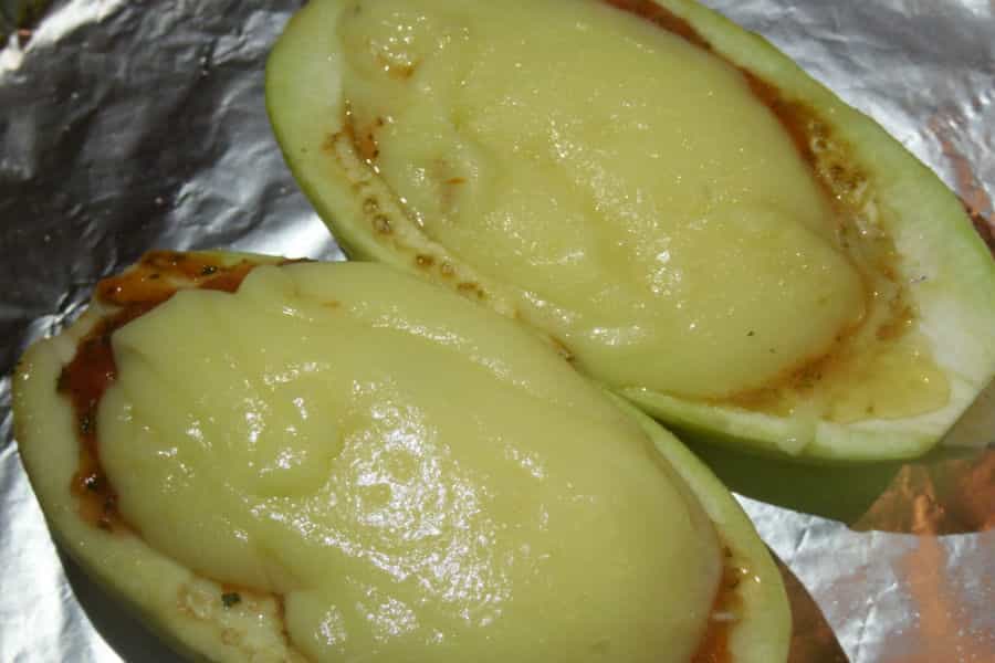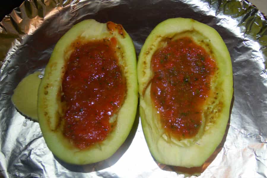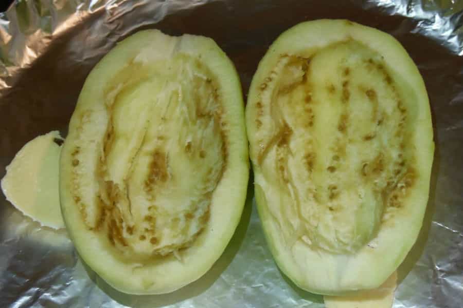 Pelar las berenjenas y partir por la mitad. Con la ayuda de un sacabocado, sácales el centro y reserva.