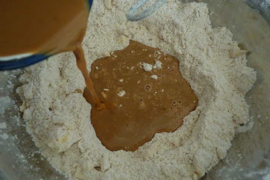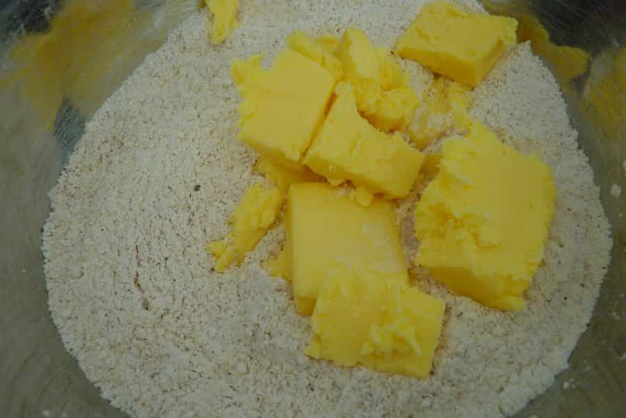 Corta la mantequilla en trozos y utilizando las paletas de masa de la batidora, una procesadora para masas, o simplemente tus manos, mezcla la mantequilla con los ingredientes secos, hasta formar pequeñas “migas”. La idea es que los trozos más grandes de mantequilla no sean de diámetro mayor a una arveja.