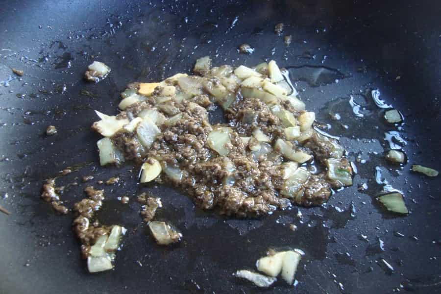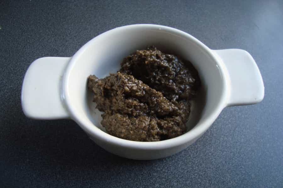 En un sartén con mantequilla derretida, agregar 2 cucharadas de aceite, 1 diente de ajo picado y ½ cebolla picada, saltear a fuego medio por 3 minutos, incorporar el puré de aceitunas, mezclar y cocinar por 2 minutos.