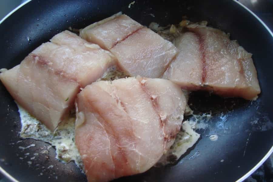 Verter el resto del vino blanco y ½ vaso de agua, disponer los filetes de vidriola, salpimentar a gusto y cocinar por 10 a 15 minutos a fuego medio. Apagar y servir la vidriola bañada en la salsa de aceitunas.