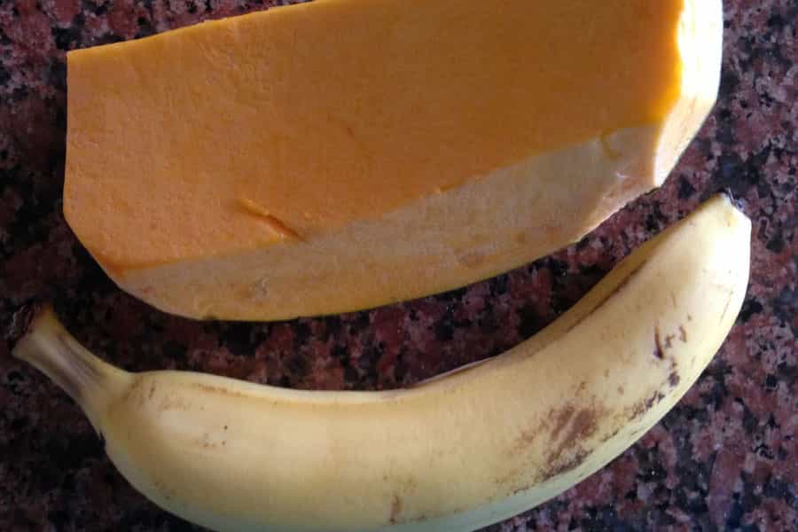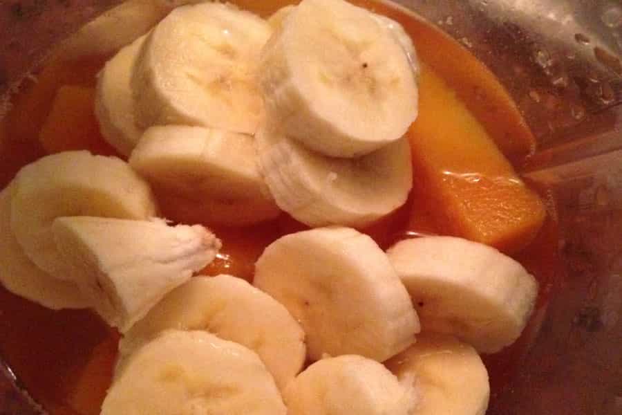 En una licuadora pondrás el plátano, el zapallo blando y el agua donde se hirvió.