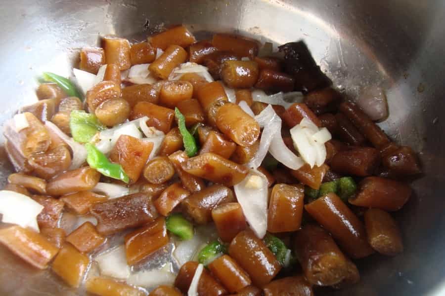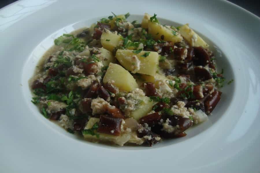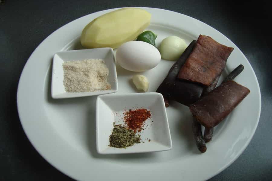 Añadir el cochayuyo cocido, las papas fritas y el pan rallado, revolver suavemente para incorporar bien, cocinar por 1 minuto. Por último añadir los huevos batidos, revolver hasta que los huevos cuajen. Retirar del fuego y servir de inmediato espolvoreado con perejil fresco picado.