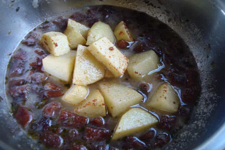 Pelar las papas y cortarlas en cubos, freírlas en abundante aceite caliente por 10 a 15 minutos o hasta que estén al dente. Escurrir y reservar.