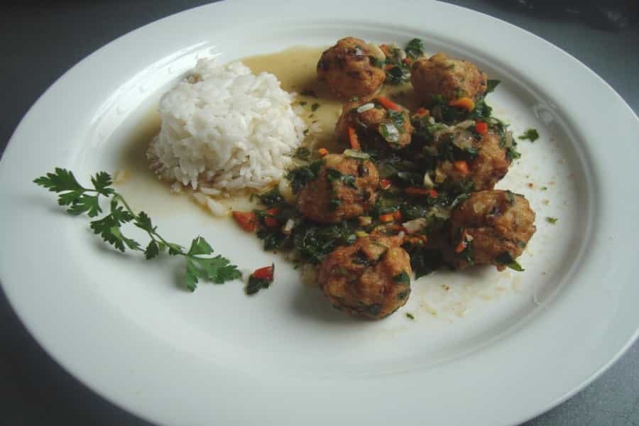Servir las albóndigas de merluza en salsa verde acompañadas de arroz o papas.