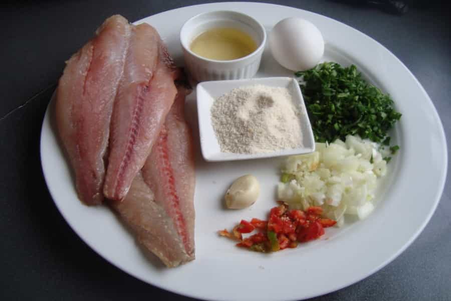 En un recipiente mezclar 1 cucharada de perejil picado, ½ cebolla picada en cubos pequeños, ¼ pimentón, 1 diente de ajo picado, pan rallado, 2 cucharadas de harina, huevos y el pescado desmenuzado. Salpimentar a gusto, revolver suavemente hasta integrar totalmente.