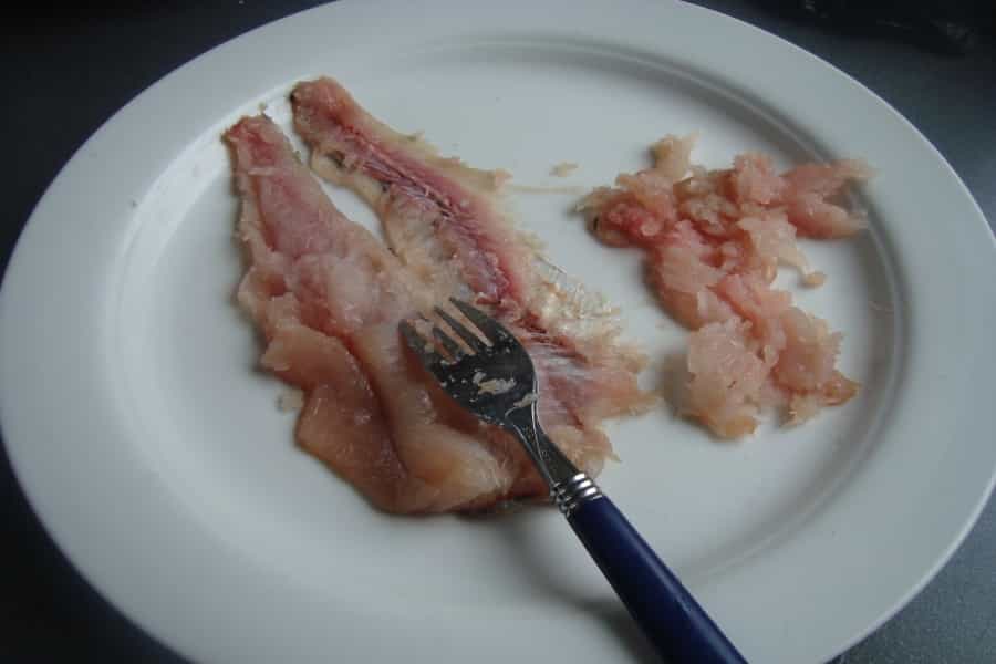 Con ayuda de un tenedor raspar los filetes de pescado para desmenuzarlos.