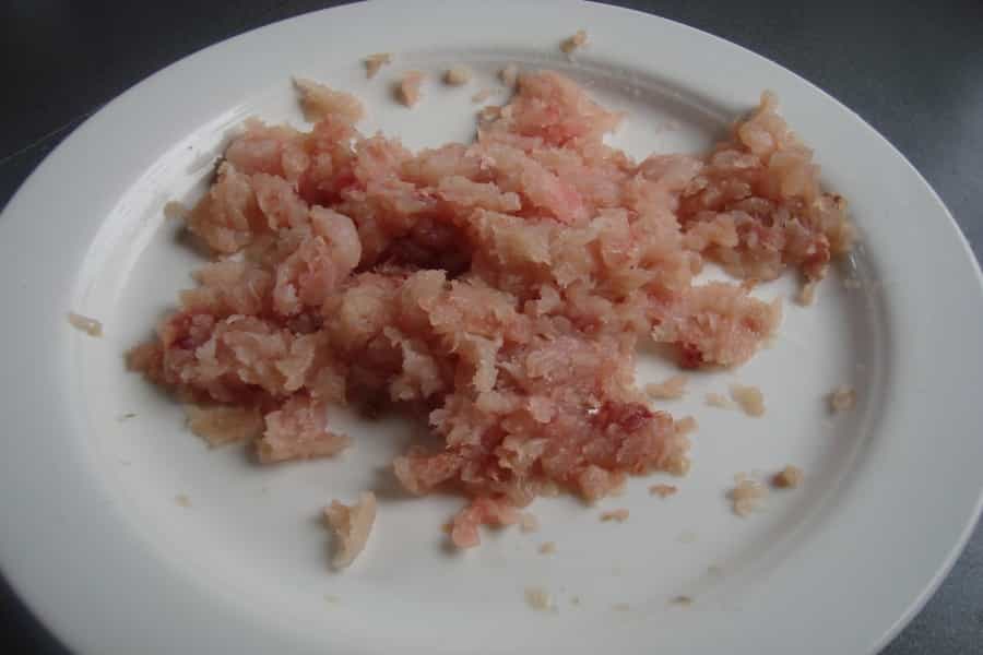 Eliminar la piel y las espinas y dejar solamente la carne de la merluza.