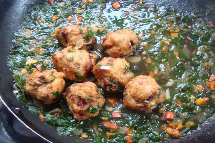 En un sartén con 2 cucharadas de aceite caliente saltear por 3 minutos ½ cebolla picada, ¼ pimentón picado, 1 ajo machacado, incorporar el vino blanco y cocinar por 5 minutos, agregar 4 cucharadas de perejil picado y las albóndigas de merluza fritas, revolver suavemente, sazonar a gusto, cuando hierva apagar.