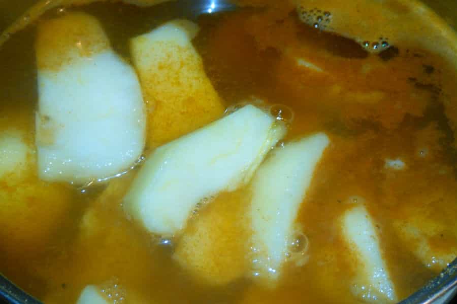 En ese caldo vamos a cocinar a fuego medio nuestras peras durante 15 minutos. Luego escurre, pero no botes el caldo. Resérvalo, porque después vamos a utilizarlo.