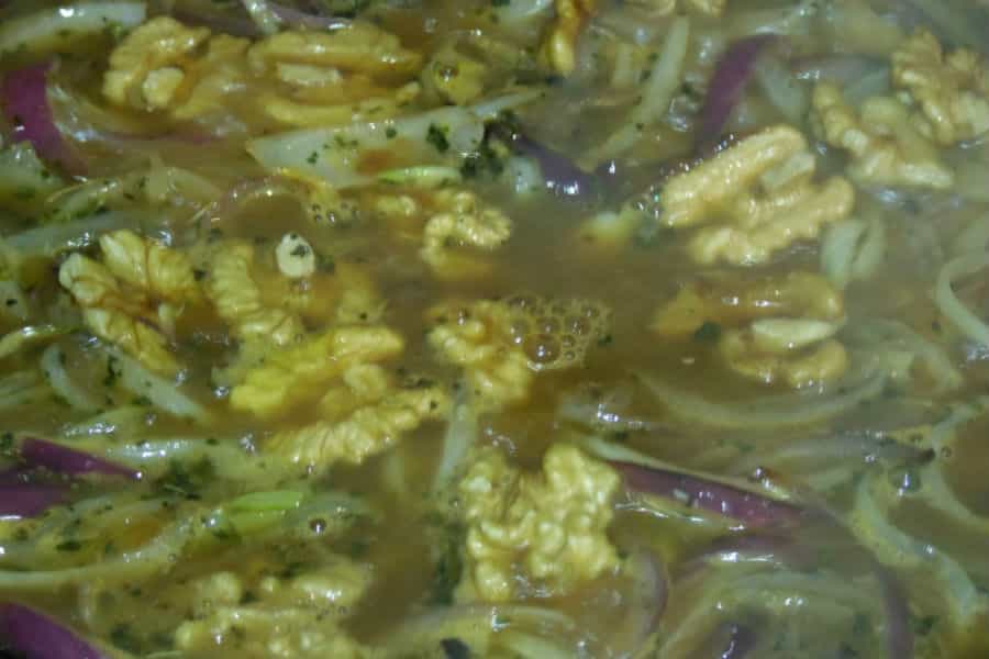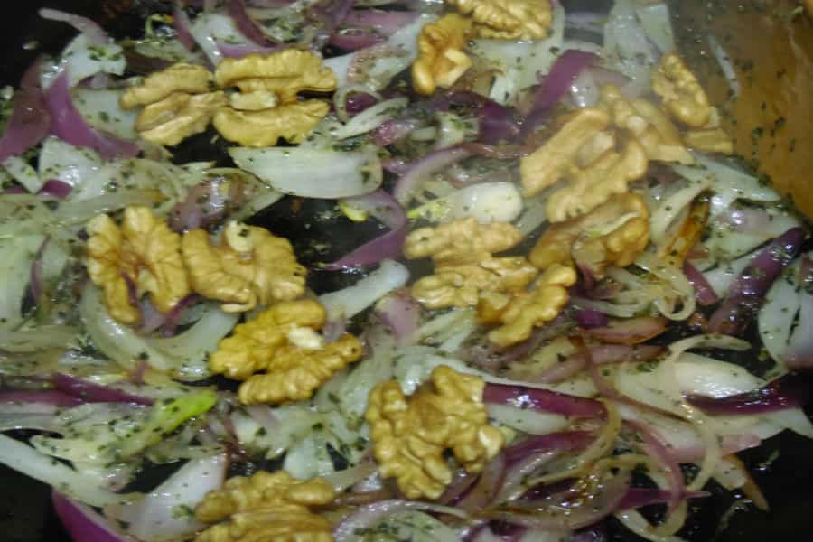 Cuando las cebollas estén casi transparentes, agregamos las nueces.